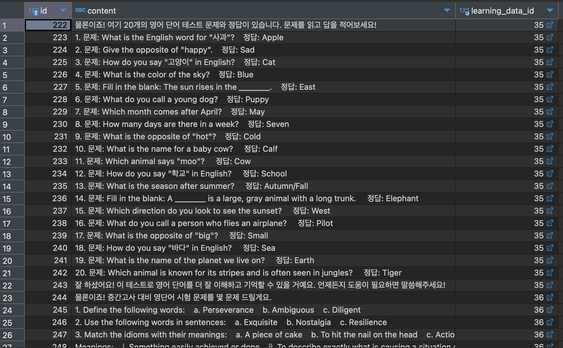 ERD를 기반으로 설계한 DB에 생성된 교육 자료가 저장되는 모습입니다.