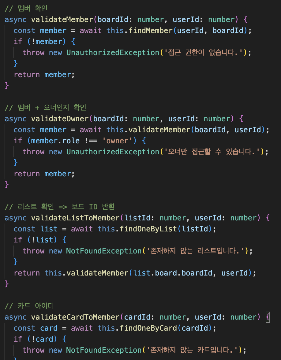 기본적으로 보드, 리스트, 카드와 관련된 API 호출 → 해당 유저가 멤버에 등록 되어있는지 조회 → true일 경우 API 호출을 진행합니다.