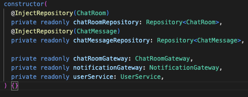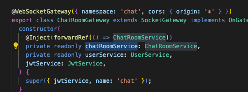 시작점이 API 요청인지, 클라이언트의 소켓 메시지인지에 따라 Gateway와 Service 간의 호출 순서가 바뀌게 됩니다. 특히, 채팅방의 생성은 다른 모듈에서 시작되기 때문에 참조 순서가 복잡하게 얽혀있습니다. 이로 인해 Service와 Gateway가 서로를 호출하며 순환 종속성이 발생했고 현재는 forwardRef() 함수를 사용하여 문제를 해결한 상태입니다.