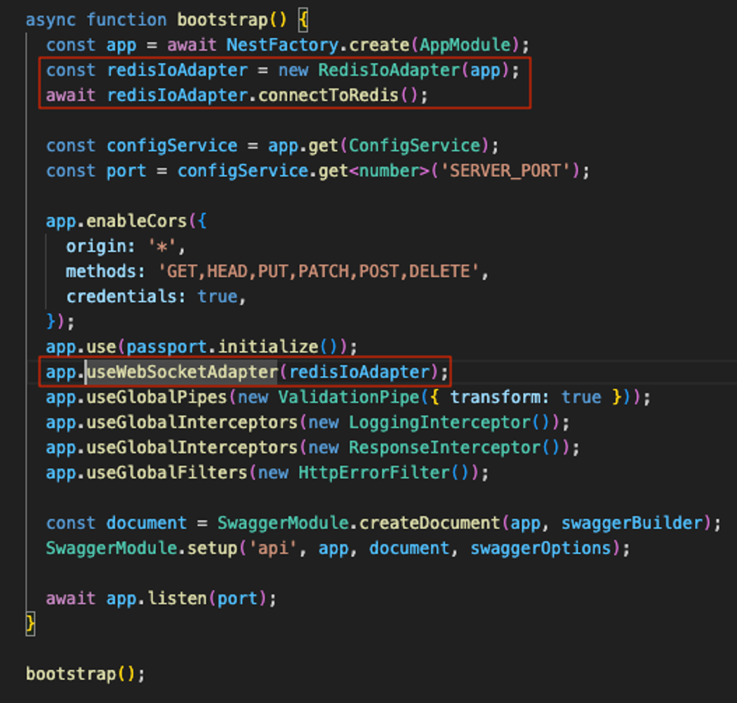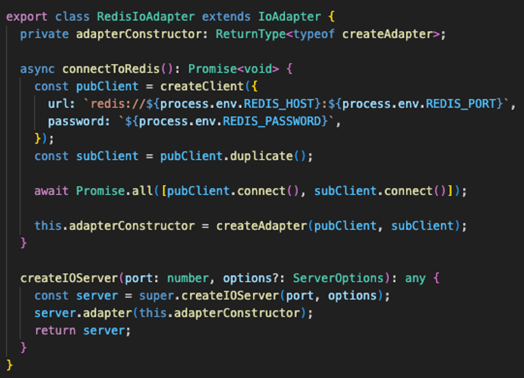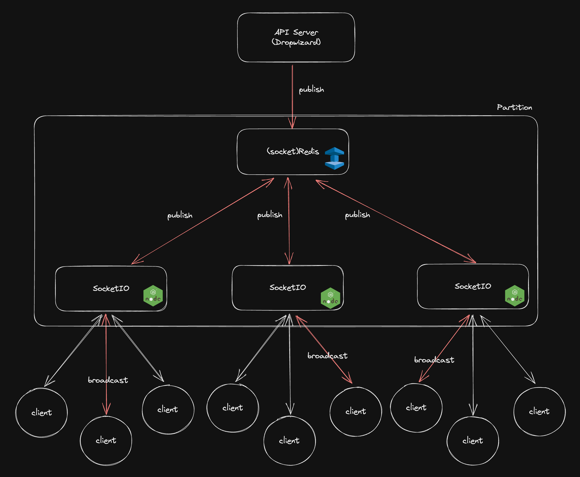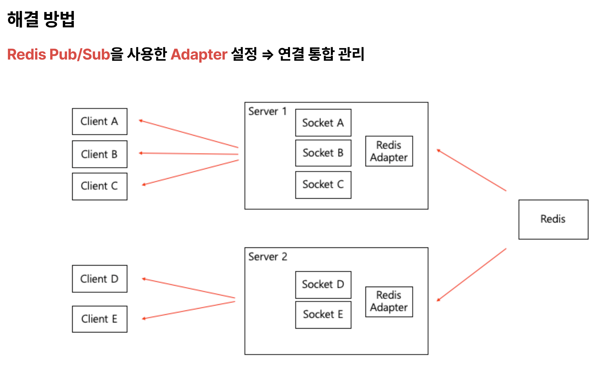 Redis 어댑터를 통해 분산된 소켓 서버들이 통합적으로 관리되고 있습니다.